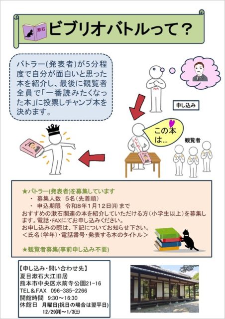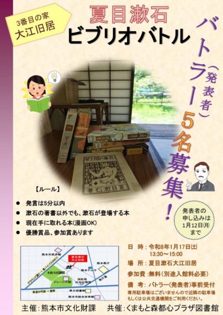 内容:ビブリオバトルとは、好きな本を持ち寄り「どの本が一番読みたくなったか」を競う書評イベント。本をお薦めしてくれるバトラーと、投票する観覧者を共に募集しています。今回は、2026年に来熊130年を迎える夏目漱石をテーマに本をオススメしていただきます。漱石が暮らした家で、ぜひその愛を語ってください!