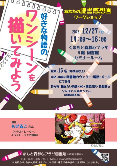 内容:あなたの好きな物語のワンシーンを、イラストで表現してみませんか? イラストレーターの、もげるこさんに教わりながら、楽しく絵を描きましょう!
