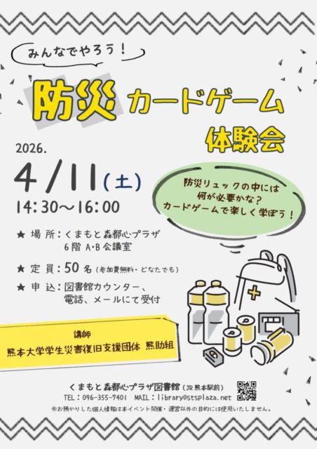 内容:防災リュックの中には、何を入れておけばいいのかな? いつ・どこで災害が起こってもすぐ避難できるように、日頃から備えておくと安心ですね。カードゲームを使って、大人も子どもも一緒に楽しく学びましょう!
